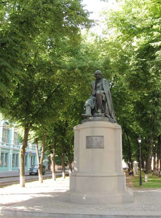 На початку алеї відвідувачів зустрічає пам’ятник Миколі Васильовичу Гоголю. Скульптура видатного письменника відлита з бронзи. Скульптор Леонід Позен створив пам’ятник ще в 1915 році, але він був встановлений лише у 1934 році. Радянська влада вважала постать автора безсмертних літературних робіт царської епохи досить «незручним», тому і не дозволяла встановлення його пам’ятнику.