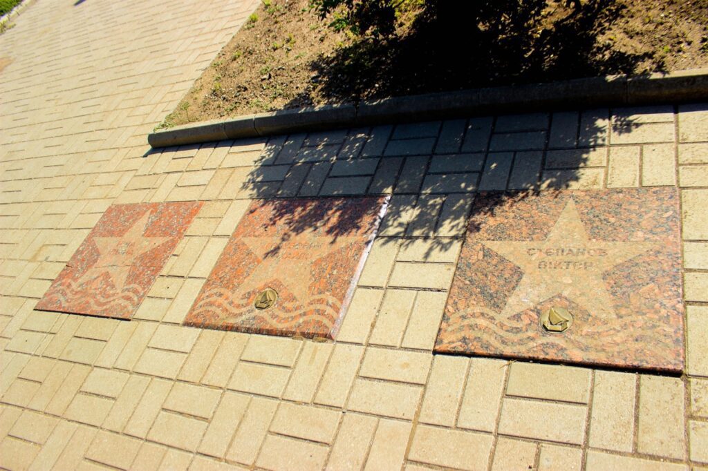 Стоячи біля монументального гранітного вітрила, від плит на вас дивляться імена тих, хто творчістю змінював культурний горизонт України. Навколо — набережна, де шум хвиль переплітається з голосами туристів. Тут кожна зірка — як невелика історія, маленька казка про людину, яка дала Бердянську трохи своєї слави. У вечірньому світлі граніт набуває теплих відтінків, а повітря наповнюється запахом моря та легким подихом творчої мрії.