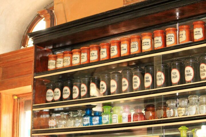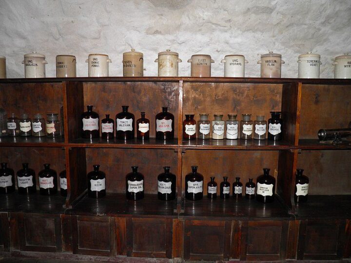 Раніше запаси медикаментів зберігалися у матеріальній кімнаті. Сьогодні тут виставлено колекції посуду для зберігання препаратів, зразки старих ліків та аптечне обладнання різних епох.