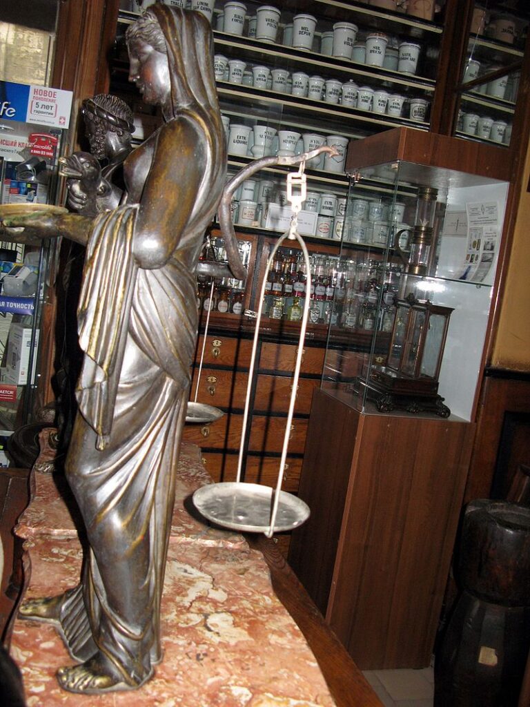 Торговий зал – це приміщення, куди спочатку потрапляє відвідувач. Стеля кімнати прикрашена поліхромними розписами, виконаними на початку 19 століття. Це овальні медальйони – своєрідні символи чотирьох прадавніх елементів Всесвіту: «Aqua» (вода), «Ignis» (вогонь), «Terra» (земля), «Aer» (повітря). Родзинкою цієї зали є різноманітні види фармацевтичних вагів. Кожні з цих вагів є унікальними і неповторними. До прикладу, одні з ваг кріпляться на двох бронзових фігурках висотою близько метру. Перша фігурка – це Асклепій, давньогрецький бог медицини, друга – його донька Гігея, богиня здоров’я.