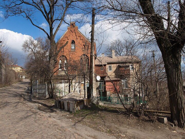 В 19 столітті цегляний будинок з гостроверхим дахом одразу привертав до себе увагу. В ті часи він височів над морем одноповерхових будівель Слобідки. Нині, якщо встати біля обриву, з боку Торгової вулиці, старовинної будівлі майже не видно. ЇЇ майже повністю затуляють велетенські крони акацій.  Стіни будинку, складені з червоної цегли, стилізований малюнок кладки, вузькі вікна зроблені «під старовину» та прибудова у вигляді вежі середньовічного замку. Все це опис будівлі, яка належала маріупольському лікарю Сергію Федоровичу Ґамперу.