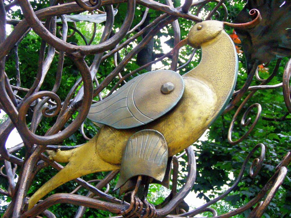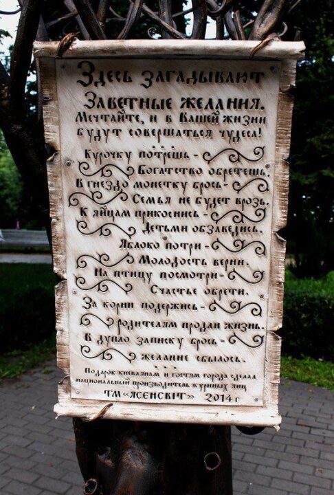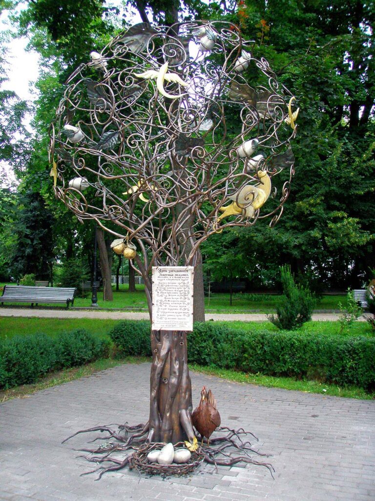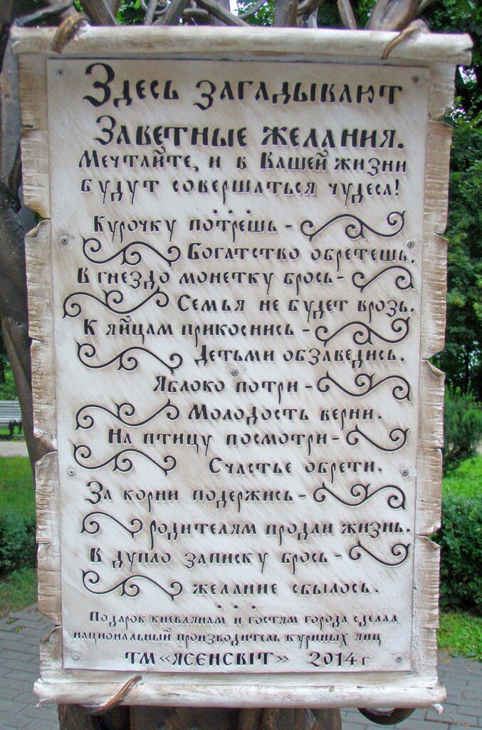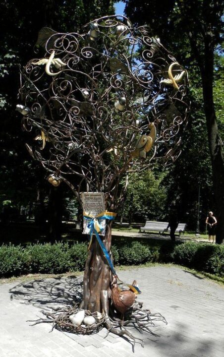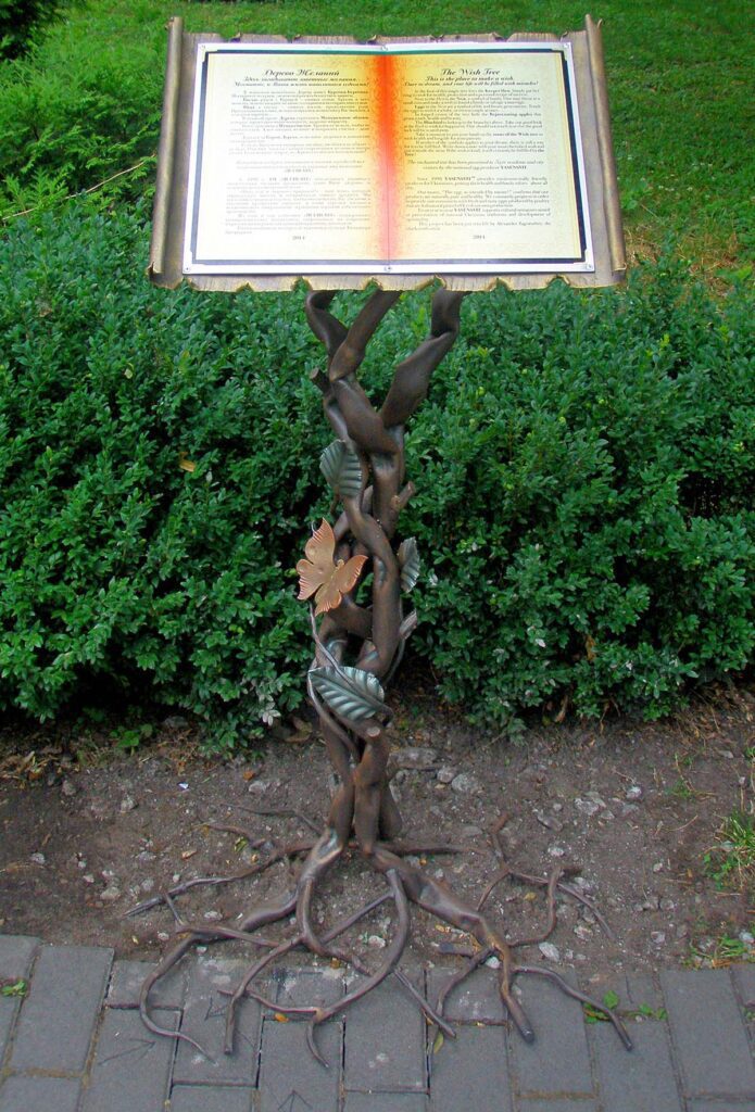 В недавньому часі в місті Києві з’явилася нова арт-інсталяція «Дерево бажань». Оригінальну скульптуру Хрещатому парку подарувала компанія «Ясенсвіт» – національний виробник курячих яєць. Незвичайна скульптура була встановлена неподалік з вежею музею води. Дивовижна ажурна скульптура має вигляд дерева, біля коріння якого лежить гніздо з чарівними яйцями, в кроні ж дерева живуть чарівні істоти.