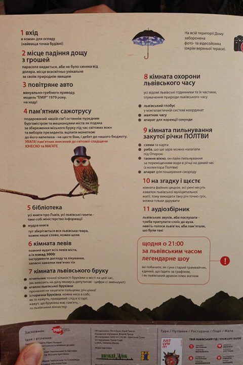 Кожен поверх Дому легенд присвячений окремій історії або персонажу. Тут можна зустріти львівського сажотруса, який живе на даху, побачити кімнату левів, заглянути до водяного дракона чи потрапити в кабінет міського хронікера. Особливою популярністю користується дах, звідки відкривається панорамний вид на старе місто. Там стоїть справжній ретро-трабант, з якого всі охочі кидають монетку «на щастя».