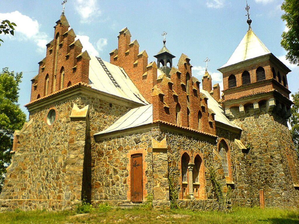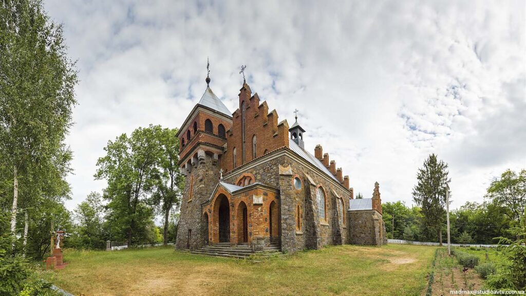 Ця велична споруда, що нагадує готичний замок з вежею, контрфорсами та кованими дверима, була побудована з ініціативи польського письменника Єфстафія Іванівського у 1912 році на місці кам’яної каплиці святої Клари, яка була філією костьолу святого Антонія села Білопілля (нині Козятинського району Вінницької області),побудованої в 1818 році коштом пана Міхаловського з дозволу керівництва дієцезії в Халаїмгородку (так до 1946 року називалася Городківка).