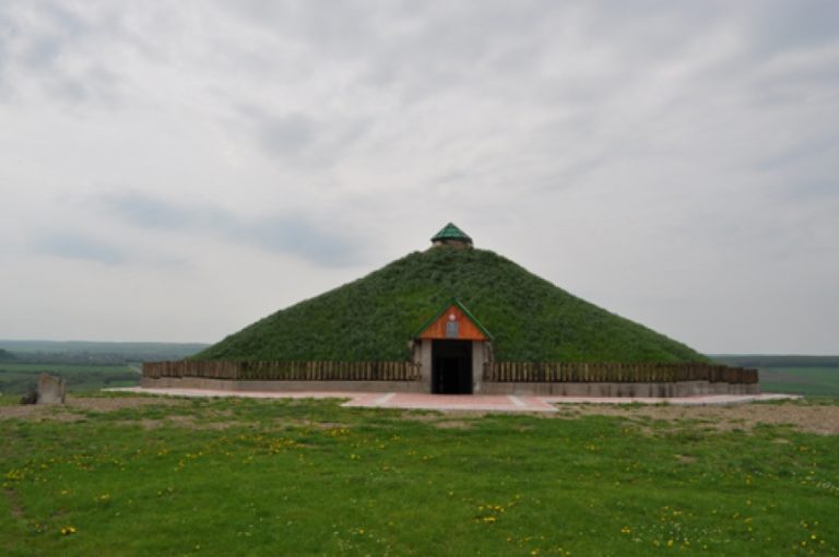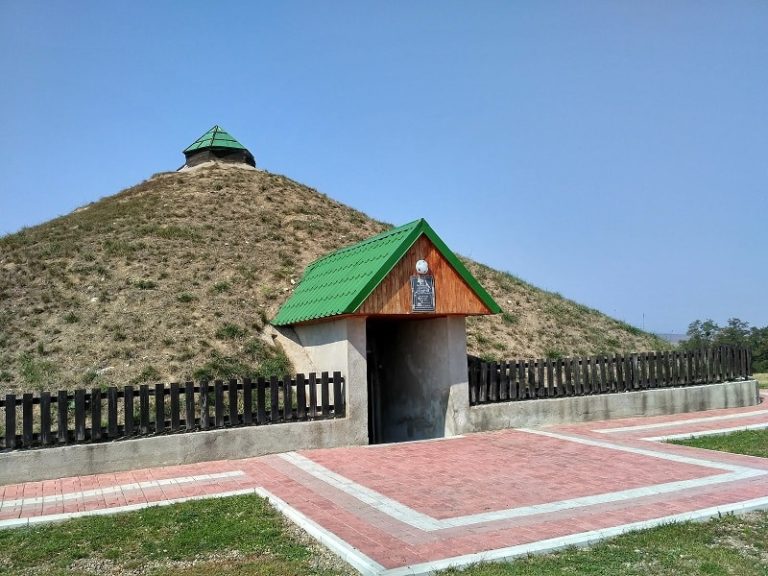 Курган «Галичина могила» у Крилосі — це самотній, пірамідальний пагорб, вкритий травою, з невеличкою дерев’яною надбудовою зверху, що нагадує вхід до музею.