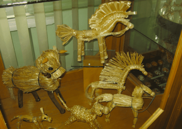 Серед експонатів музею можна побачити різноманітні вироби із соломи: фігурки тварин, птахів, рибок, чоловічків, а також предмети побуту, такі як скриньки та вінки. Особливе місце займає фігурка солом’яного бичка — героя відомої української казки, яка стала символом музею.
