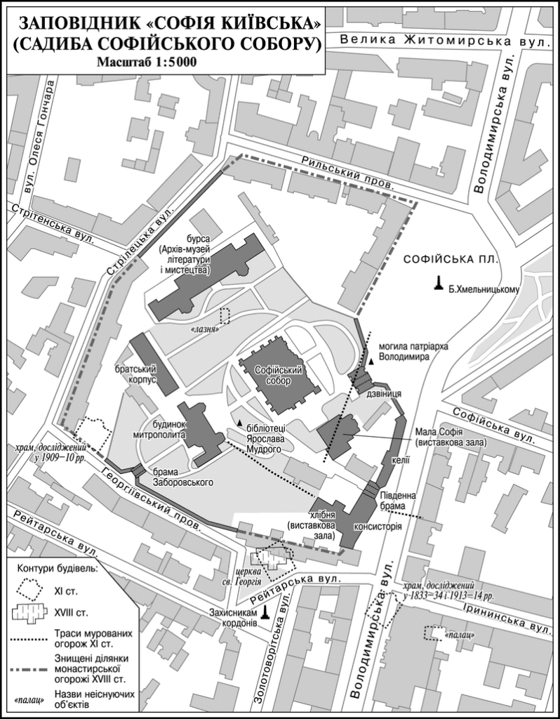 Головною пам’яткою заповідника є Софійський собор — п’ятинефний хрестовокупольний храм із 13 банями. Усередині собору збереглися унікальні мозаїки та фрески XI століття, зокрема славнозвісне зображення Оранти (Богоматері, що молиться), яка стала символом охорони Києва.