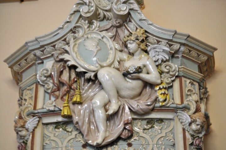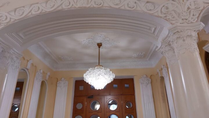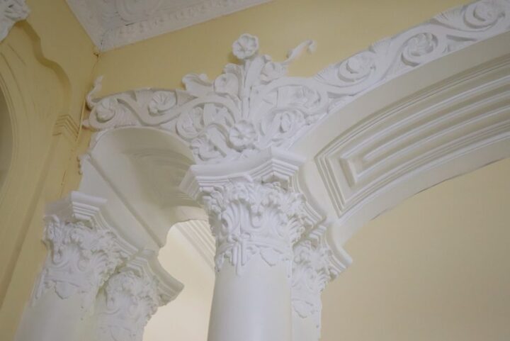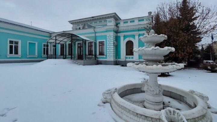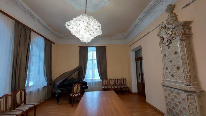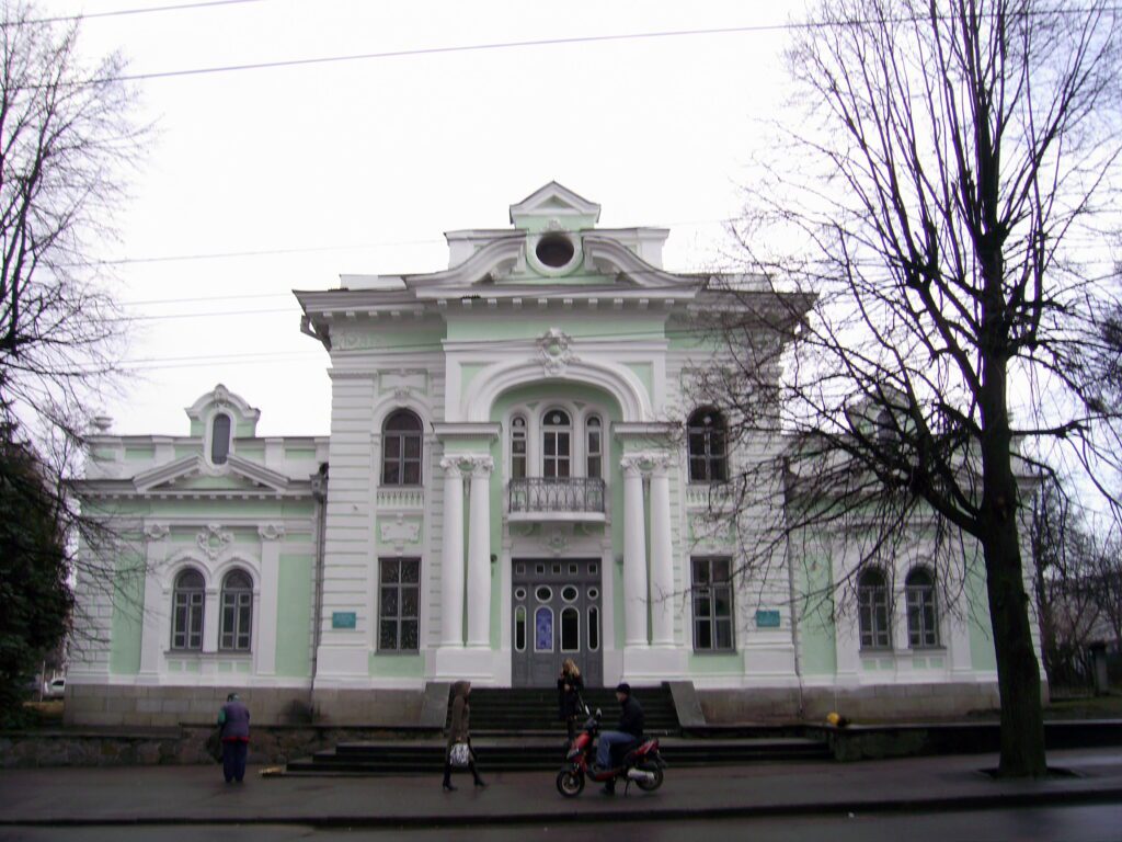 Архітектура особняка вражає своєю елегантністю та витонченістю. Будівля умовно поділяється на три частини: центральну, яка виступає вперед, та два бічні крила. Фасад оздоблений білими арками, витягнутими округлими вікнами та пишною ліпниною, що надає будівлі вишуканого вигляду. Приємний зелений колір фасадів у поєднанні з білими колонами створює гармонійну палітру, яка підкреслює архітектурну довершеність споруди.