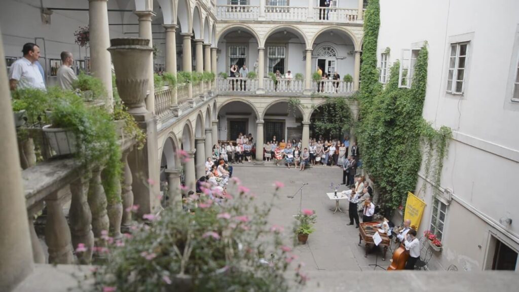 Родзинкою палацу Корнякта є Італійський дворик. Це місце дуже схоже із типовими двориками Флоренції і Риму. В теплу пору року в Італійському дворику працює кафе, проходять фестивалі класичної і джазової музики та відбуваються традиційні концерти. Унікальна акустики цього місця створює неперевершене враження. Форми ренесансного палаццо в Італійському дворику зберігаються завдяки суворому фасаду, що підкреслений чітким ритмом вікон, прикрашених трикутними мандриками та легким ажурним аркадам лоджії. Відкриті аркади з’єднують головний будинок із офіцинами. Гості кафе мають можливість постояти поруч з пранґером – ганебний стовп, в середньовіччі біля такого стовпа карали злочинців.