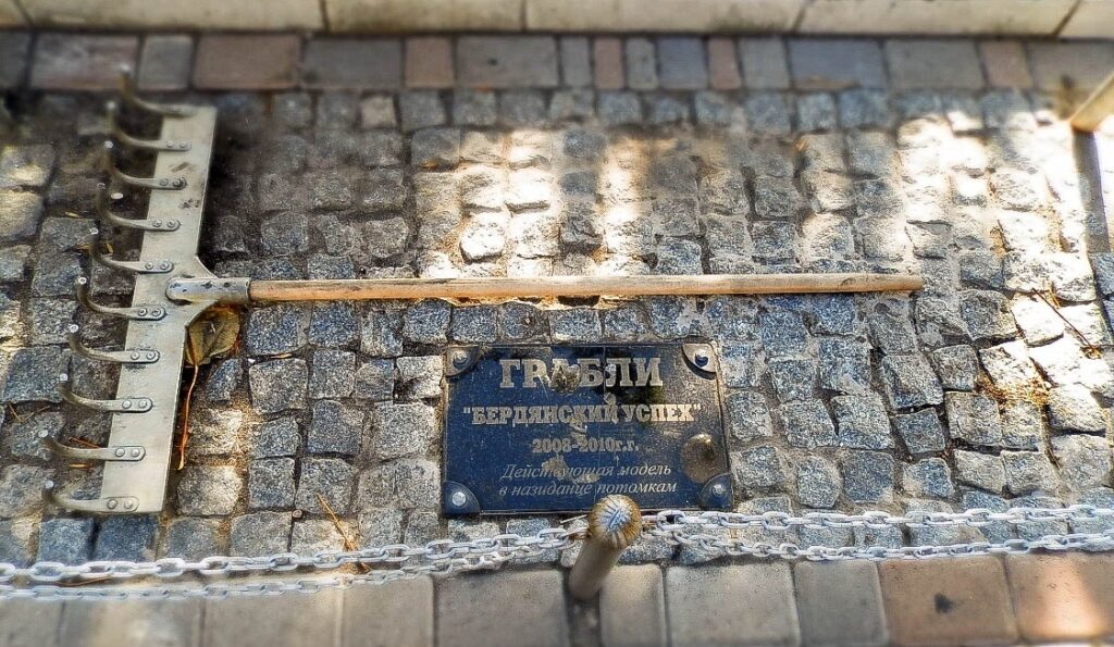 Бердянськ – це місто, в якому постійно з’являються нові і оригінальні архітектурні скульптури. Ідеєю створення чергової цікавої скульптури, городяни завдячують тодішньому мерові міста Валерію Баранову. Так в червні 2011 екс-мер представив жителям міста новий пам`ятник, який мав вигляд звичайнісіньких сільськогосподарських грабель. Однак ця скульптура мала символічний символ, до неї був доданий напис: «Граблі« Бердянський успіх »2008-2010 рр. Діюча модель науки нащадкам ». Мер пояснив, що людям притаманно робити помилки, проте з помилок потрібно витягувати уроки і не повторювати їх знову, а ці граблі будуть слугувати людям в якості нагадування про це. Після відкриття пам’ятнику, юрба народу вишикувалась, щоб випробувати дію грабель. Містяни вирішили запровадити примету, яка говорить про те, що якщо наступиш на ці граблі, то цілий рік не зробиш помилок.