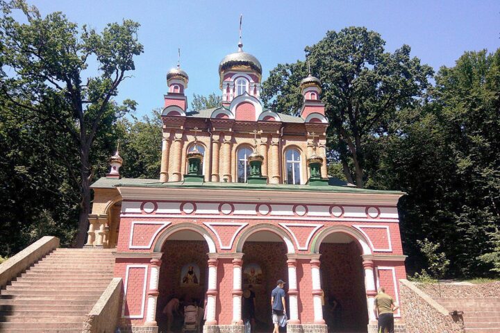 Величний рожево – білий Пантелеймонівський храм з яскравим багатим оздобленням, видно з будь – якого куточка Феофанії. У 1905 році будівництво храму доручили архітектору Є.Ф. Єрмакову, а вже у 1914 році храм було освячено. У 1930-х роках всі храми Феофанії були закриті радянською владою, ченців виселили, а приміщення монастиря віддали у користування різним організаціям. 7 травня 1990 року всі церковні споруди повернули до громади Української Православної Церкви. У 2002 році тут було створено Свято – Пантелеймонівський жіночий монастир, а через три роки було побудовано чернечий корпус із будинковим храмом. Поруч з монастирем знаходяться три цілющі джерела: Пантелеймона, Сльози Божої Матері та Архангела Михаїла. Поруч з джерелами розташована купіль, що має чудотворні дії. Кажуть, щоб зцілитеся, треба тричі поринути, перехреститися і прочитати молитву Святому Пантелеймону.
