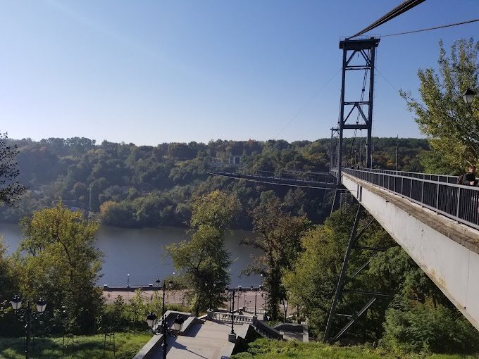 Підвісний пішохідний міст через річку Тетерів. Цей міст – це наймальовничіше місце парку.  Місток на металевих тросах був споруджений, як частина великого комплексу Бойової слави у 1982 році. Довжина мосту сягає 350 метрів. З цієї унікальної конструкції відкривається прекрасний краєвид на місто, води Тетеріва, греблю і скелі біля парку. З берега річки добре проглядається білосніжна альтанка, збудована у 1953 році – символ міста Житомира.
