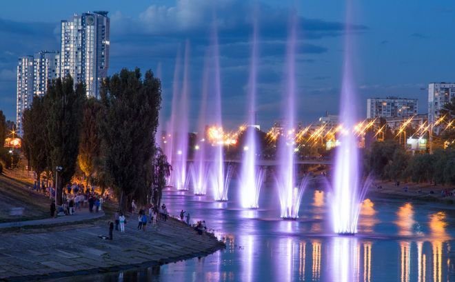 В місті Києві на лівобережжі Дніпра вдовж набережної житлового масиву Русанівка, розташований дивовижний комплекс гейзерних водограїв – Русанівські фонтани. Ці чудові фонтани були зведені, в якості окраси новозбудованого прогресивного та модерного району, у 1976 році. Висота водяного струменю композиція сягає більш ніж 30 метрів.