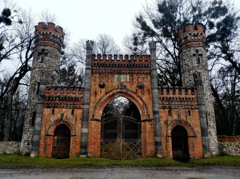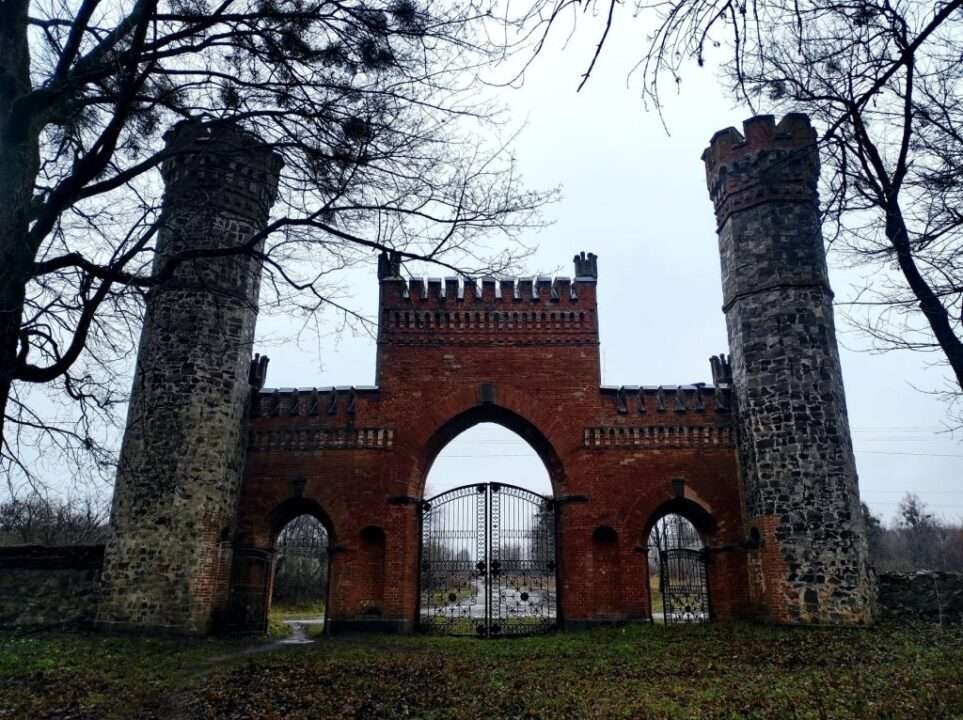Не менш вражаючими були в’їзні споруди. “Золоті ворота” 1875 року — трипрогонова арка з шестигранними вежами, зубцями та центральною аркою для проїзду — уособлювали мавританський або неоготичний стиль. На мармуровій дошці колись красувався латинський напис: “Ad maiorem Dei gloriam anno 1875 exec. A. Miclachevski” (“Для більшої слави Господа…”). Поруч — готичні ворота з порцеляновими гербами роду. А парк на 25 гектарах, закладений у 1829–1830-х, був пейзажним шедевром: липові алеї, стави, екзотичні дерева, що гармонійно вписувалися в ландшафт.