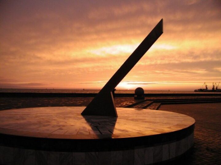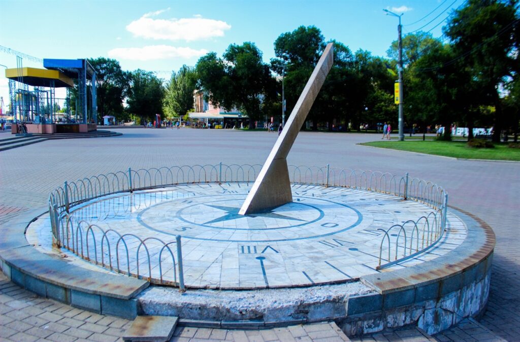 Курортне місто Бердянськ, що на Запоріжжі відоме на всю Україну своїми унікальними скульптурами і пам’ятниками. Серед численних пам’яток міста можна виділити горизонтальний сонячний годинник. Годинник має бетонну поверхню, яка вкрита чорними і білими мармуровими плитками в стилі флорентійської мозаїки. Діаметр циферблата становить 6 метрів, на ньому нанесені годинні і хвилинні ділення з інтервалом в 15 хвилин. Стрілка зроблена з нержавіючої сталі і має довжину 3,3 метра. Стрілка встановлена в центрі циферблату і спрямована з півдня на північний полюс світу під нахилом 46,8 градуса. Час визначається за положенням сонячної тіні на розподілі циферблату, яку стріла відкидає на сонці.