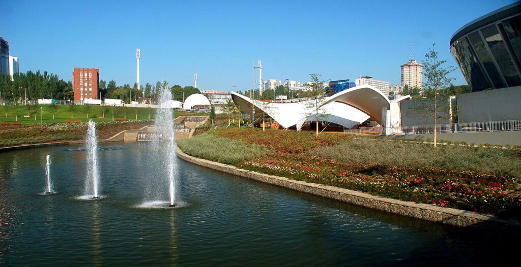 Фасад стадіону покритий склом, щовечора його підсвічують синім кольором, в поєднанні з променями прожекторів, стадіон візуально набуває вигляду діаманта. Перед стадіоном на площі розташований 40-тонний гранітний м`яч-фонтан, що обертається під тиском води. Сам стадіон оточений красивим парком, ставками, фонтанами і каскадом водоспадів.