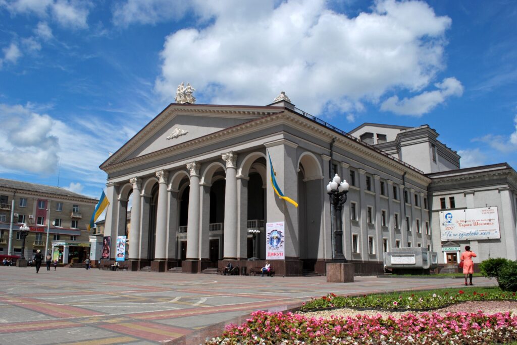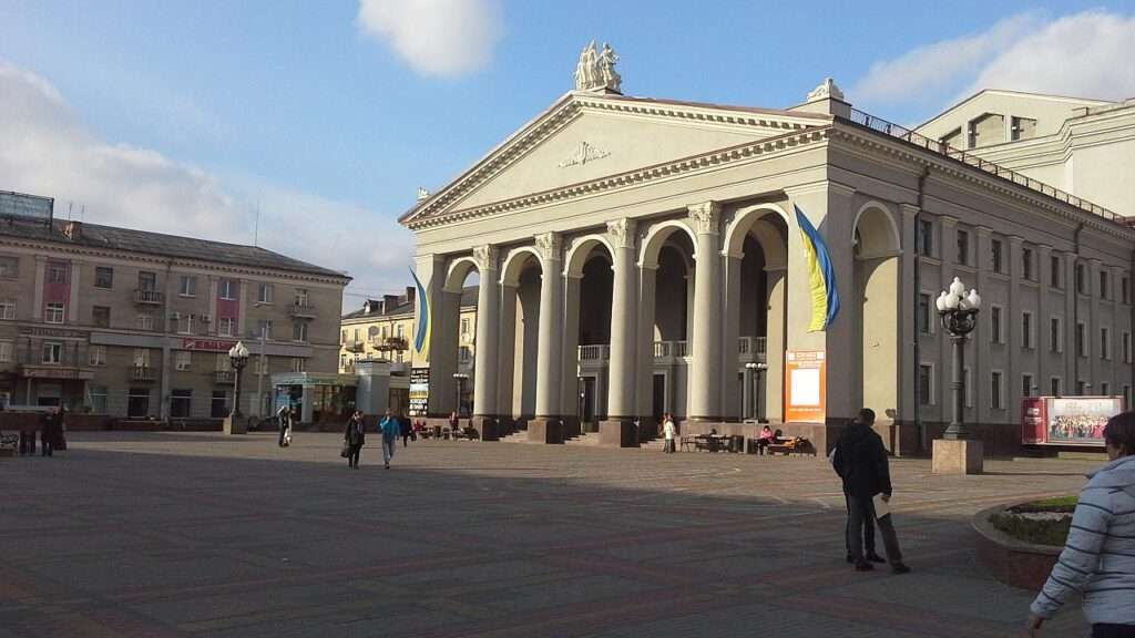 Сьогодні перебуваючи на Театральній площі можна побачити навпроти театру будинок, де в 1941–1943 роках розміщувалась редакція газети «Волинь», в якій працювали видатні українські письменники Олена Теліга та Улас Самчук. З правого боку від драмтеатру стоїть готель «Україна».