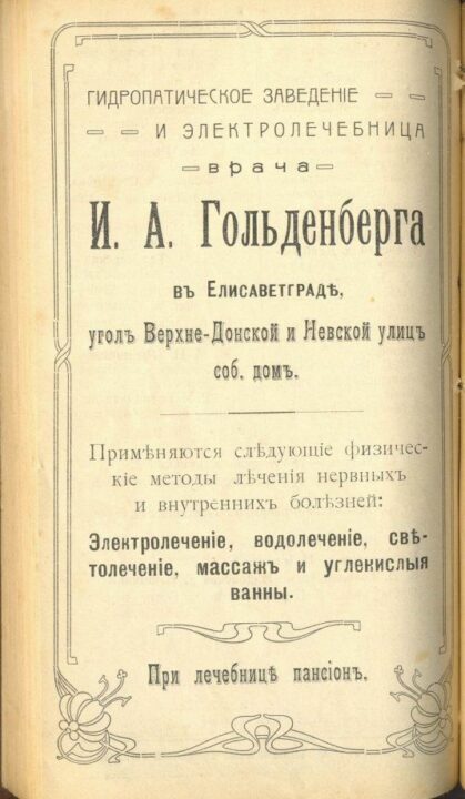 Лікарня Гольденберга була однією з найсучасніших медичних установ свого часу. Вона спеціалізувалася на лікуванні нервових захворювань, використовуючи передові методи, такі як лікувальні ванни, аеротерапія, ультрафіолетове опромінення та електрофорез. Ці процедури прирівнювалися до курортного лікування на водах, що робило лікарню популярною не лише серед місцевих жителів, а й серед пацієнтів з інших регіонів.