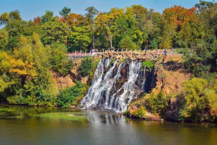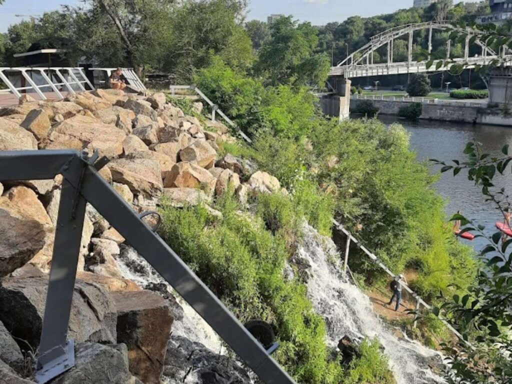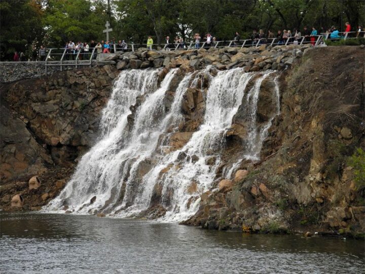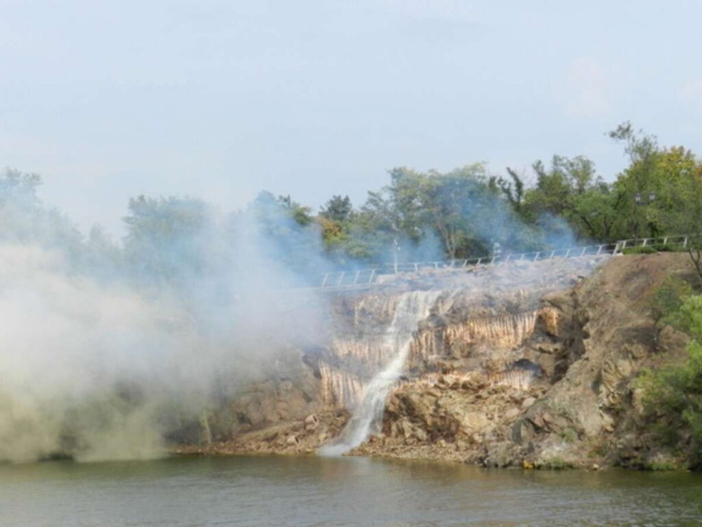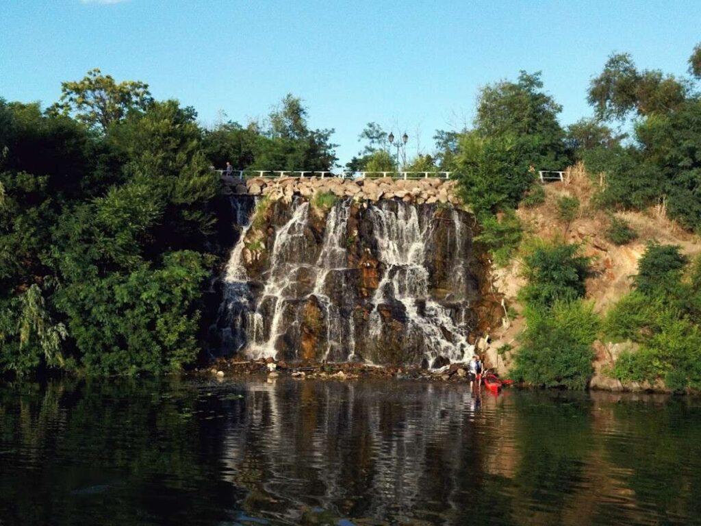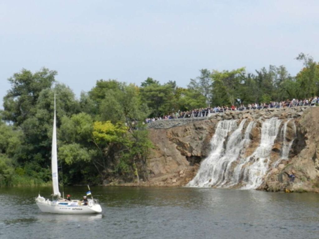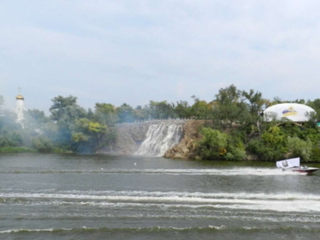«Поріг Ревучий» це – єдиний штучний водоспад в Україні. Створив це диво архітектор Дмитро Волік. Висота водоспаду 17 метрів, ширина – 20 метрів. Жодного камінчика з природного моноліту не було знято при облаштуванні водоспаду, натомість до нього було додано ще 70 тонн каміння,що було підібрано таким чином,щоб його вік збігався з віком граніту на самому острові. Каміння було привезено зі степів Солонянського району, потім його змонтували на водоспад. Продуктивність водоспаду складає 1600 кубічних метрів на годину. Колосальний обсяг води з глибини 3 – х метрів ріки Дніпра качають насоси. Завдяки самовідданій праці підрядника будівництва, директора ПП «Нова» Богдана Водолажченка, всі роботи були проведені без пошкоджень ландшафту. Водоспад може працювати в декількох режимах. Родзинкою місцевого дива є те, що водоспад підсвічується в формі та кольорі Державного прапору України.