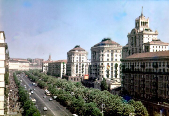 В 1944 році починається відбудова центральної вулиці столиці України. Архітектори намагалися поєднати ландшафт із особливостями забудови. В результаті Хрещатик перетворився у широку магістраль та з’явився каштановий бульвар. Будівництво Хрещатику завершилось у 50 –х роках, саме з цього часу вулиця набуває сучасних рис.