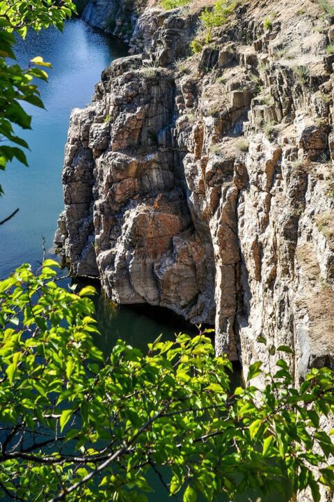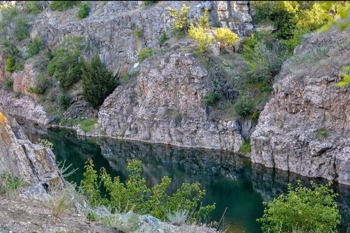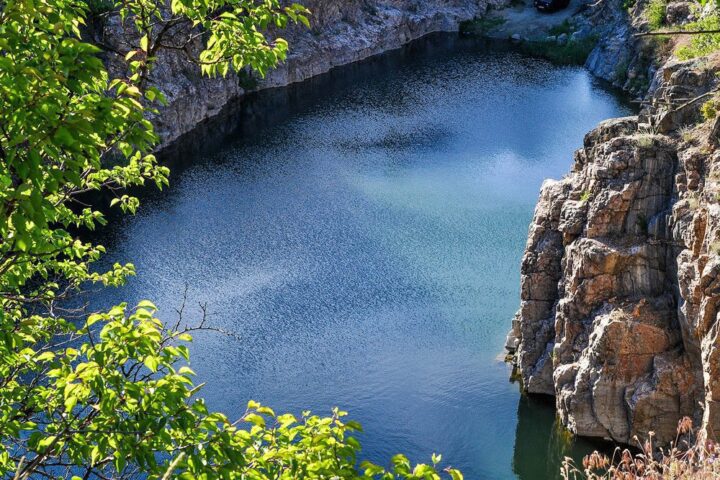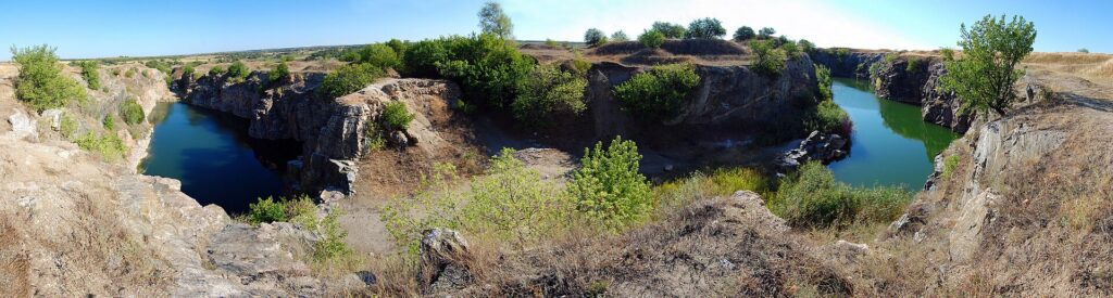 Загальна площа кар’єру становить близько 5 гектарів. Він складається з кількох котлованів. Два котловани наповнені водою і розділені між собою скельною перемичкою. Решта котлованів сухі. В найдальшому котловані є невеликий грот. В результаті затоплення кар’єру виникли дивовижні озера з блакитною водою.