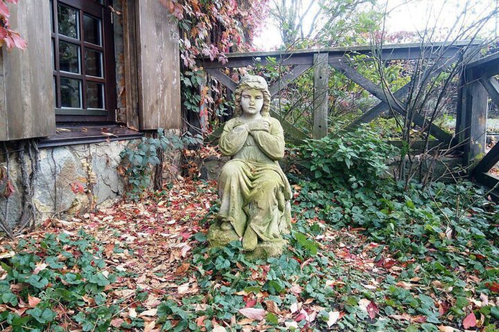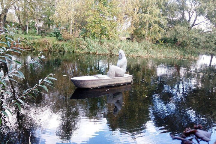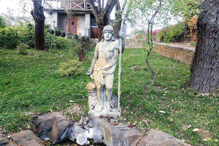 Територія парку прикрашена оригінальними скульптурами XVII—XIX століть. Серед сучасних скульптур, можна побачити Пам’ятник Єлисею Плетенецькому, який було виконано українським скульптором Владиславом Волосенком, на замовлення і за ідеєю Ольги Богомолець. Пам’ятник зображує монаха, який, схиливши голову, пливе у човні; перед ним лежить розкрита книга, а в руці він тримає свічку, що горить вдень і вночі. Річка символізує плинність часу, човен — людське життя, книга — знання і життєвий досвід попередніх поколінь, свічка — просвіту і служіння людям.